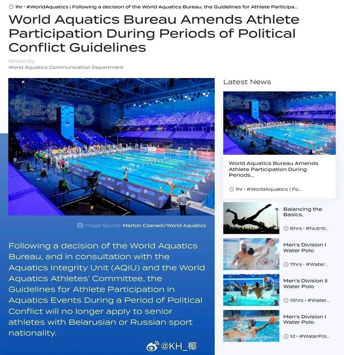 北京时间4月14日,世界泳联官方宣布,将取消对俄罗斯和白俄罗斯运动员的参赛限制,允许他们在国际赛事中升本国国旗、奏本国国歌!